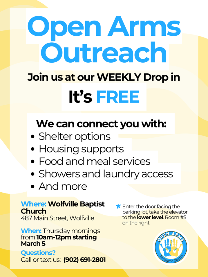 Beginning Thursday, March 5th, 2026, Open Arms is providing outreach workers, in Wolfville, who will be located in Room 5, lower level, of Wolfville Baptist Church. Outreach workers will be there each Thursday from 10:00 AM to noon. They will be available to provide direction to the services noted above. As well, clients who may need assistance accessing financial support and requiring help accessing and preparing forms for submission to service providers can access that support through these outreach workers.